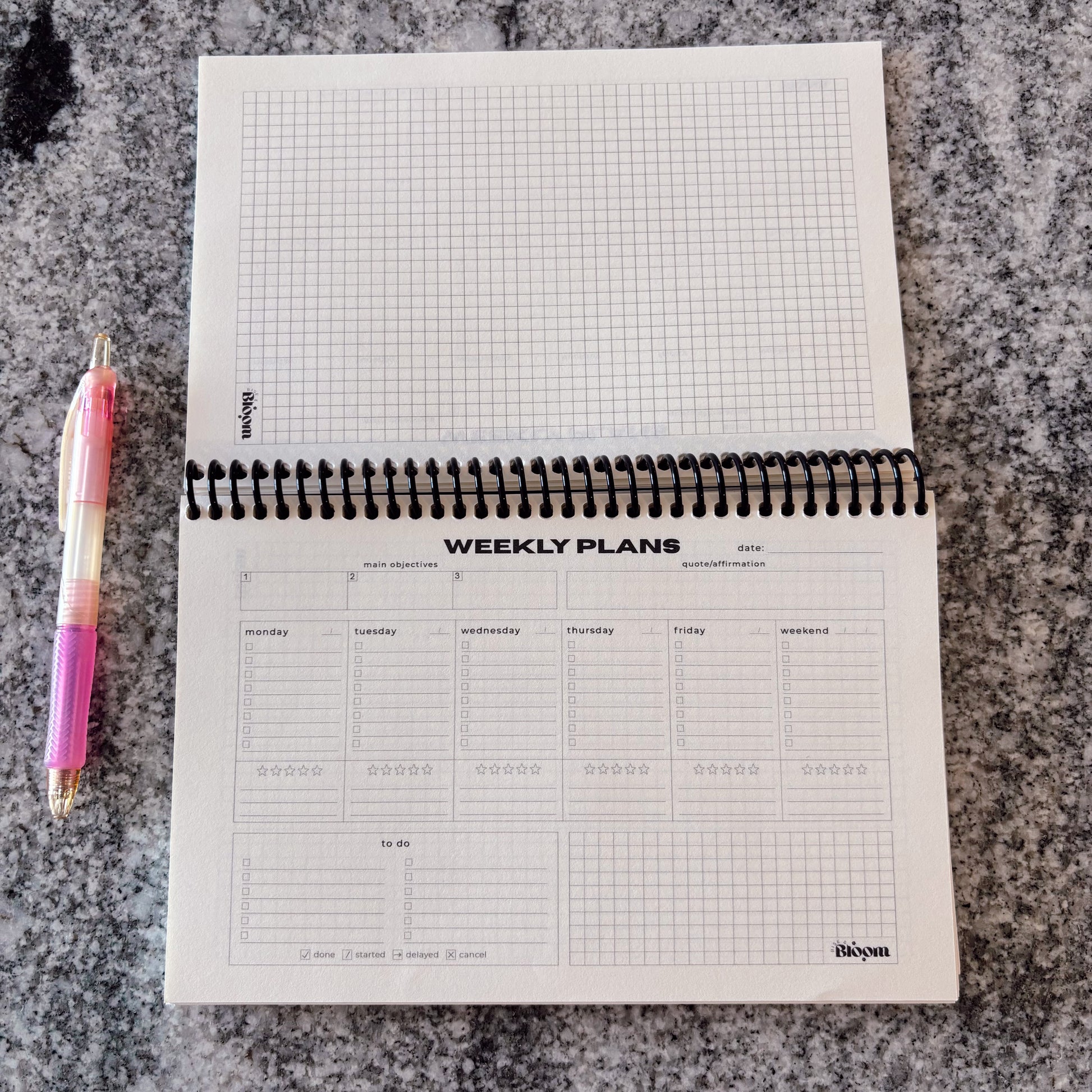 - 198 pages - 64 weekly planner pages, 134 lined and grid journal pages
